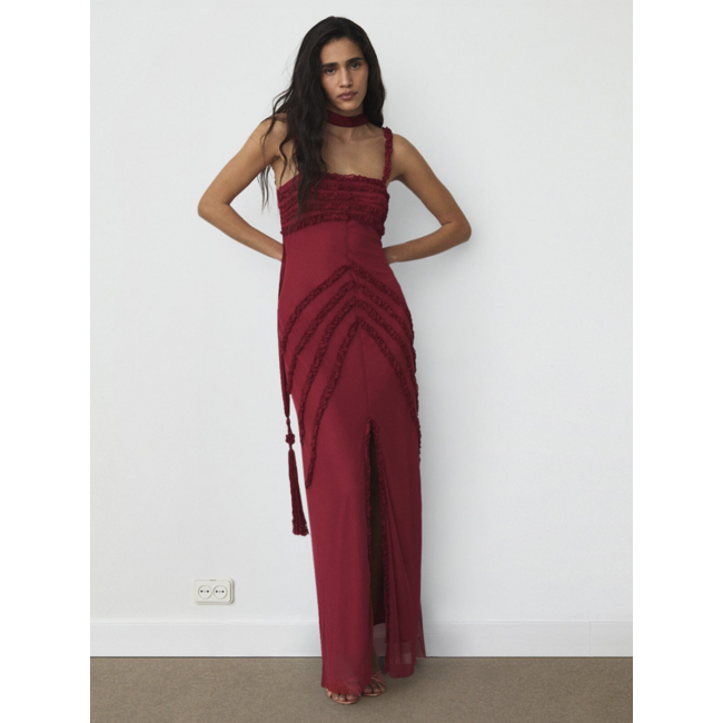 Long tulle dress with straight neckline and multi-position thin ruffle straps. Tonal interior lining. Ruffle trims details and front vent at the hem