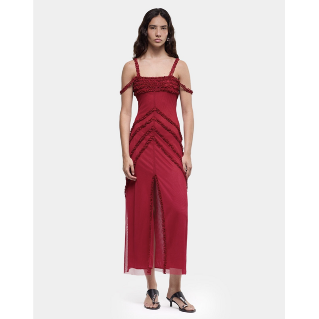 Long tulle dress with straight neckline and multi-position thin ruffle straps. Tonal interior lining. Ruffle trims details and front vent at the hem