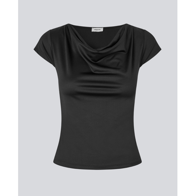 Fitted black T-shirt with draping. The Himamd Drapy T-shirt is made from 95% recycled polyester and features an elastic fit. The sophisticated draping adds a feminine and modern twist, perfect for both everyday and evening looks.
