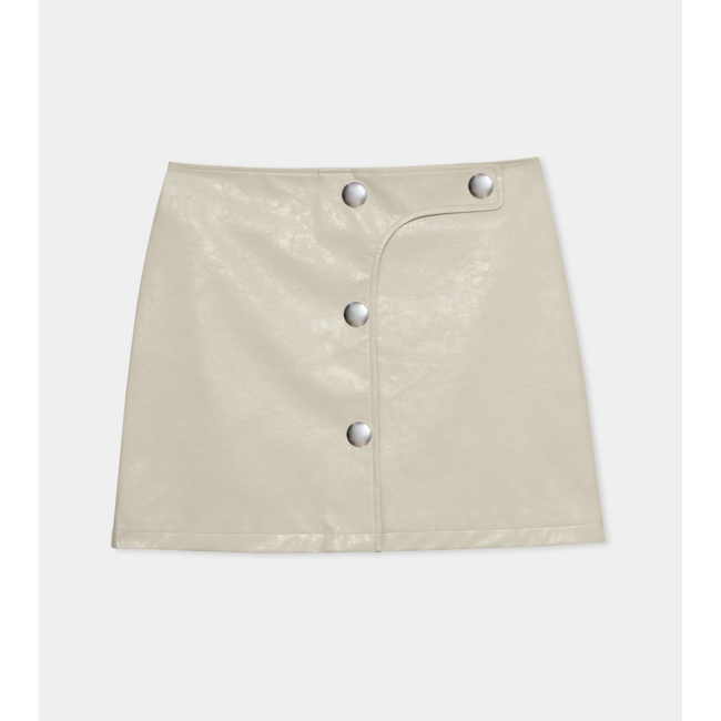 High-waist faux-leather short skirt featuring asymmetrical front closure with metallic silver snap buttons. Back closure with invisible zipper. Black lining.