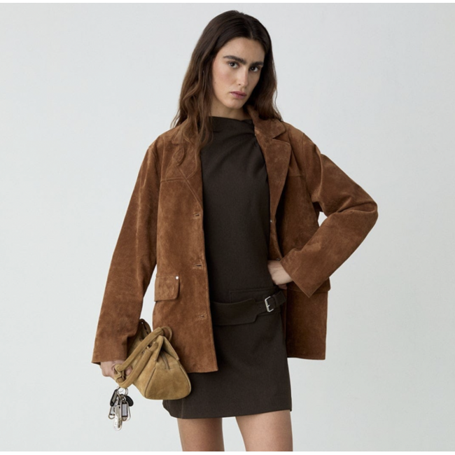 Oversize tailored suede jacket with suit lapels and long sleeves. Features yoke pieces, side flap pockets, front self-covered buttons, and back loop with metal imagotype. Back slit opening. Black lining