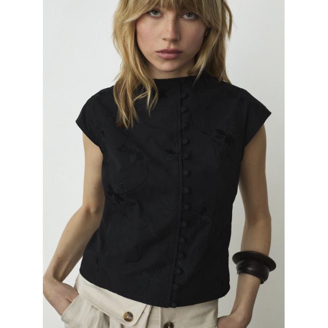 Short-sleeve blouse with button-front closure, made of embroidered fabric. High collar with wide neckline and positional closure. Fitted silhouette with darts and seam details. Short length
