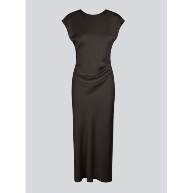Elegant satin dress in brown made from 96% recycled polyester. The UnityMD Dress features short sleeves, an ankle-length silhouette, and beautiful draping at the waist that accentuates the figure. The deep back and tie detail add a feminine and sophisticated touch.